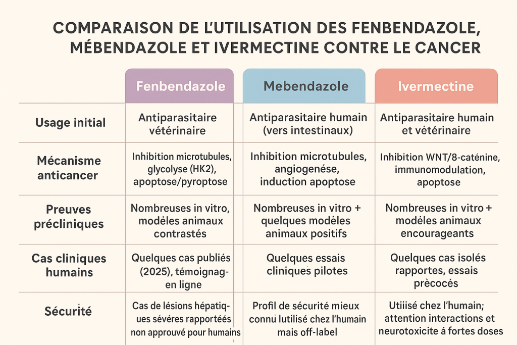 Cet article propose une synthèse complète des bénéfices rapportés, en distinguant ce qui relève de la recherche scientifique de ce qui vient de témoignages, et termine par une fiche comparative avec deux autres molécules anthelminthiques étudiées contre le cancer : mébendazole et ivermectine.